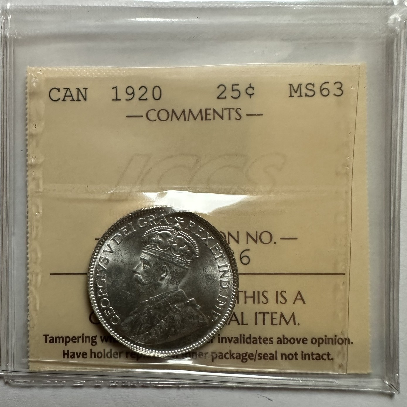 1920 Canada 25-cent ICCS Graded MS-63