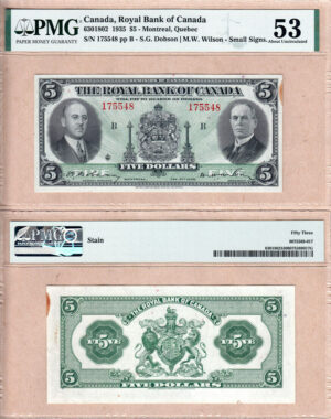 1935 $5 Royal Bank of Canada AU-53 banknote – Small Signatures