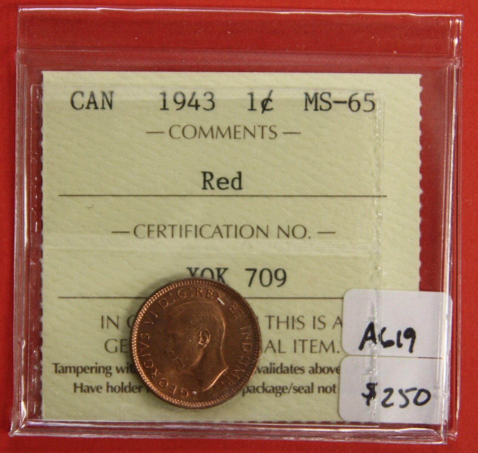 1943 Canada 1-Cent ICCS Graded MS-65 RED