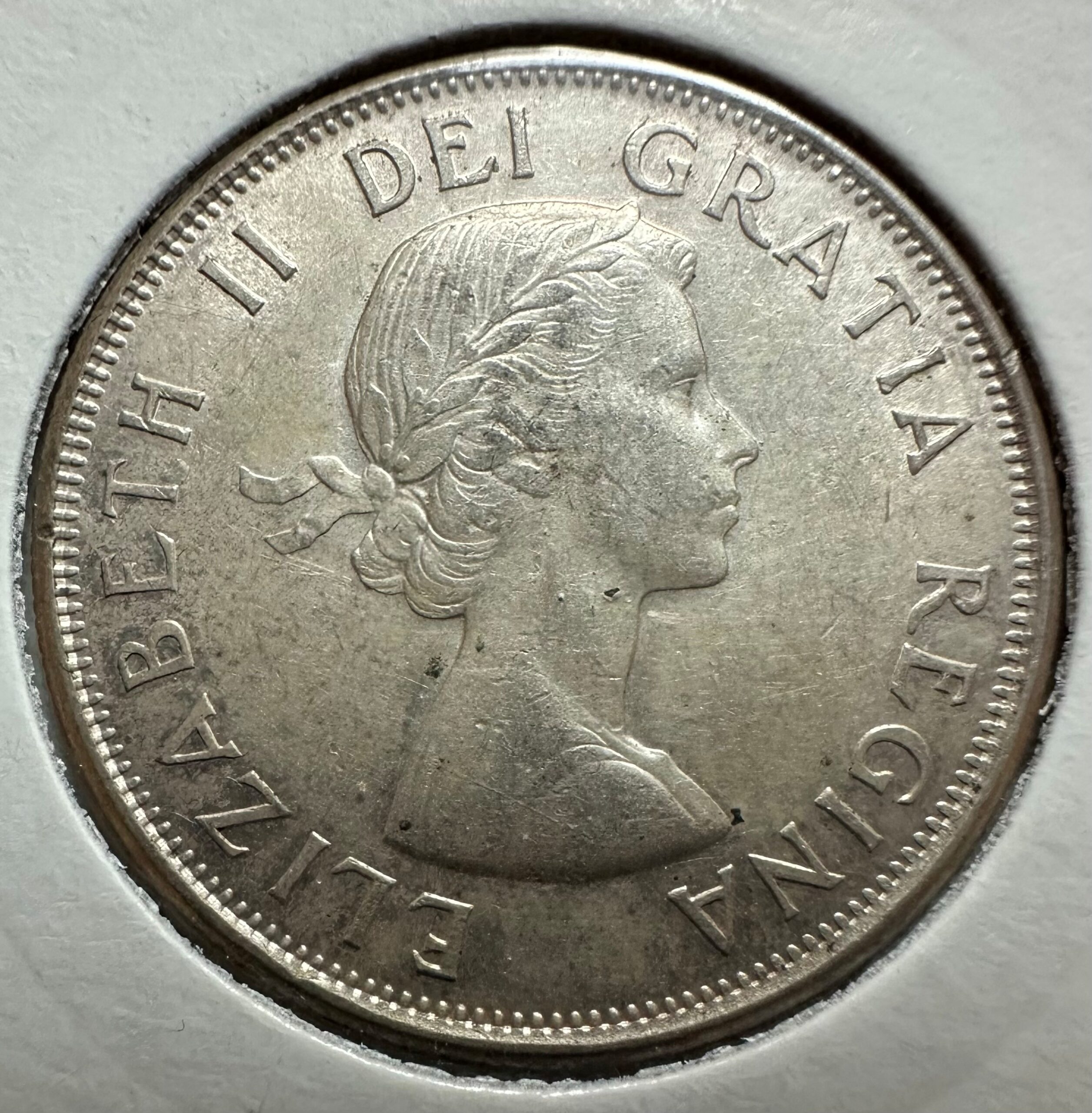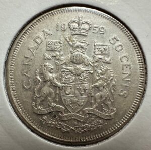 1959 Canada 50-cent 0.800 Silver Circulated Coin – EF/AU
