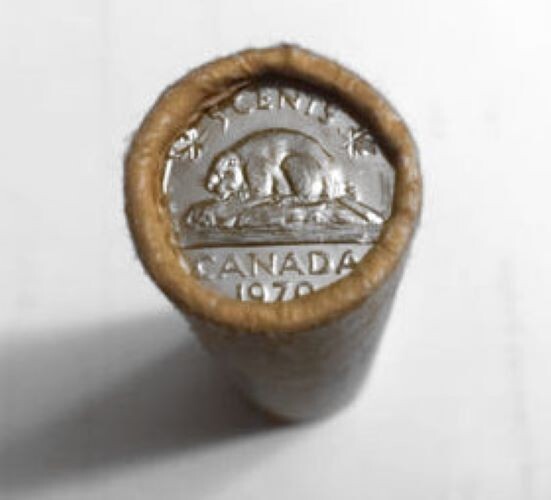 This bank roll of 1970 Canada 5-cent nickels is in uncirculated condition and comes in its original bank wrapped (OBW) packaging.