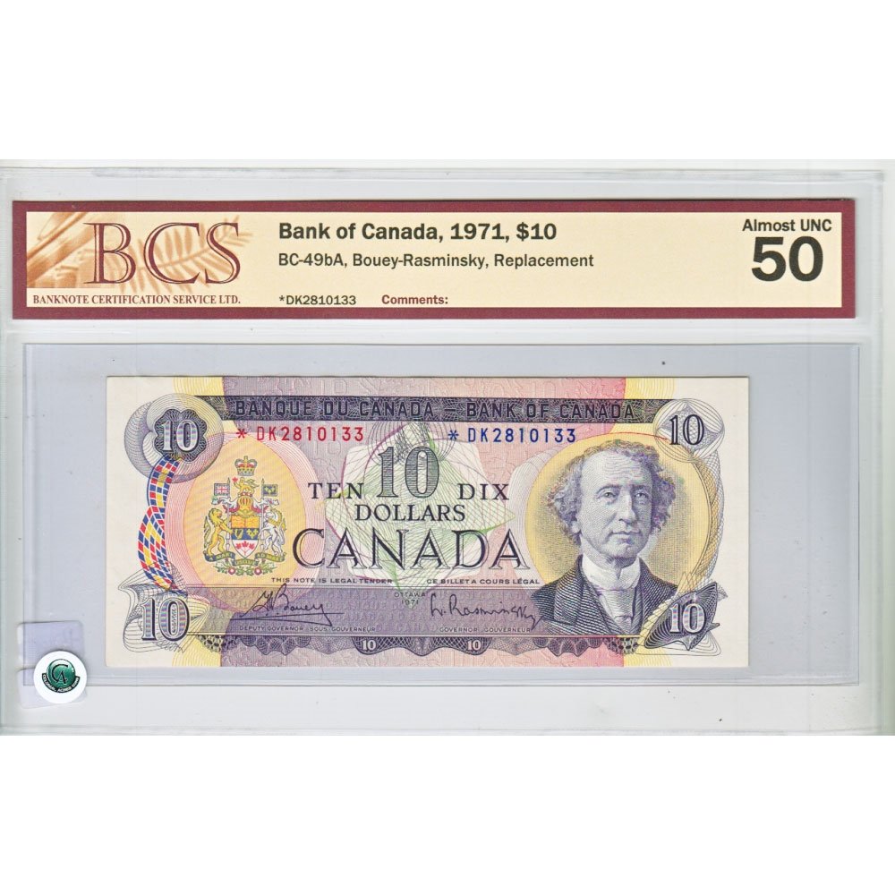 1971 $10 *DK Prefix Bouey-Rasminsky BC-49bA AU-50 Replacement Note