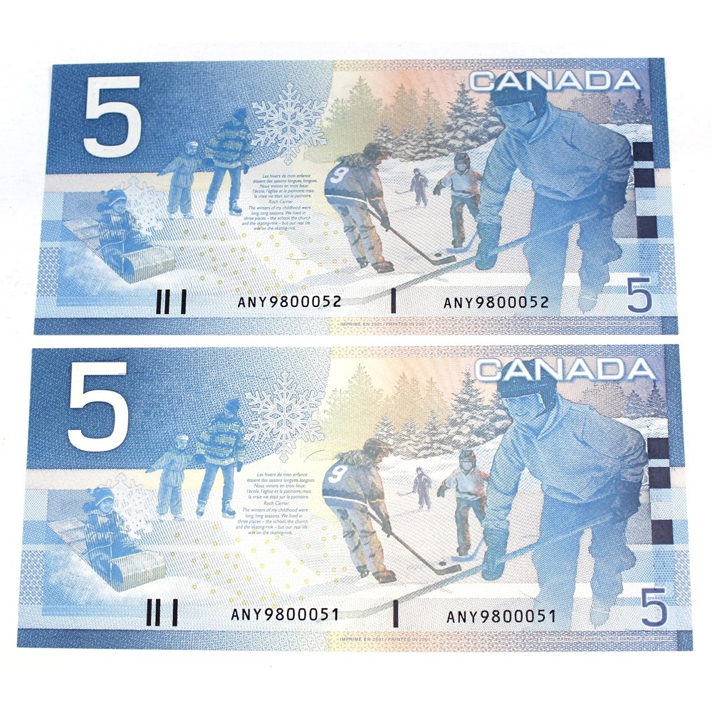 2001 $5 AOE Prefix BC-62a Knight-Dodge 2 x UNC Consecutive Notes