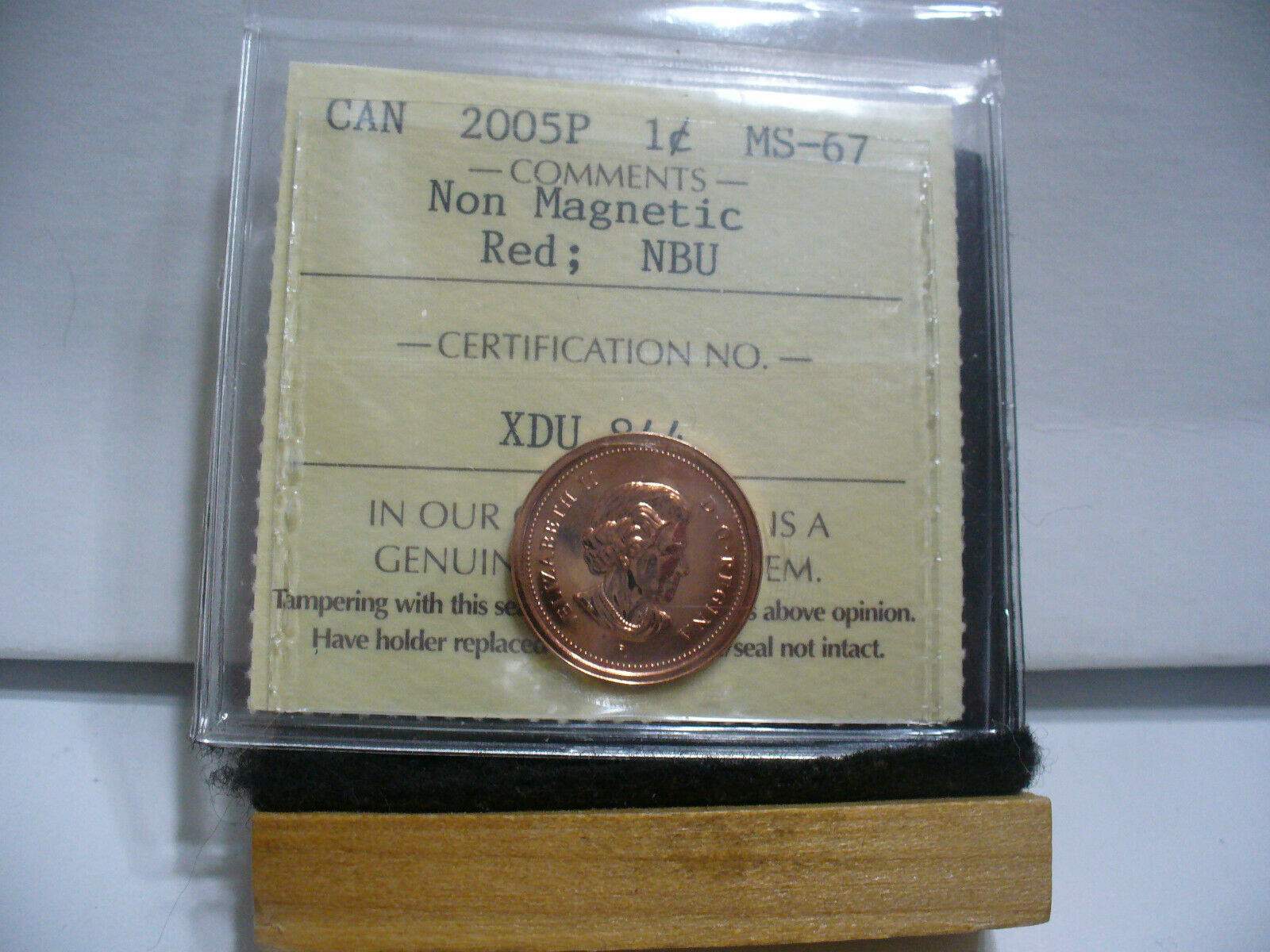 The P designation was used in 2005 to distinguish coins made with Canadian planchets with steel cores which are attracted to a magnet (magnetic), while coins struck on planchets with zinc cores, did not have the “P” mint mark (non-magnetic).
