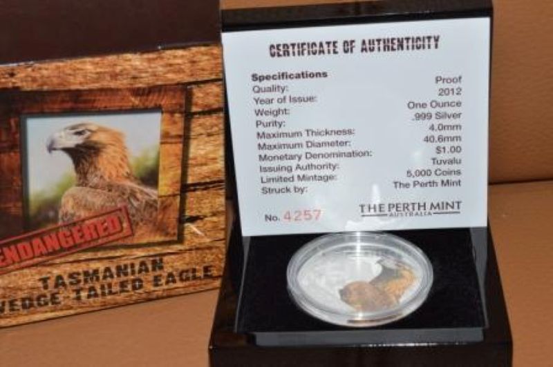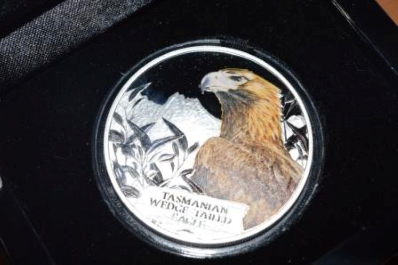 The Wedge-Tailed Eagle, the largest raptor of Tasmania, is featured on this beautiful silver proof colorized coin!