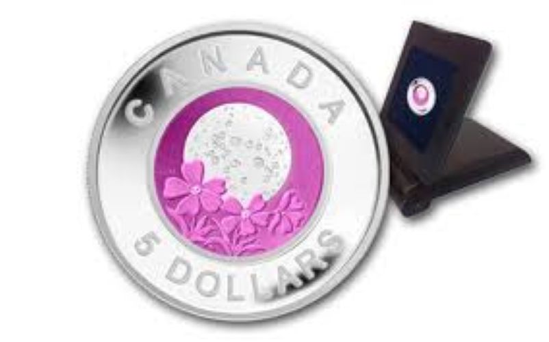 This five-dollar Canadian coin is certified to have an outer ring of 92.5% sterling silver and a niobium insert at its centre. It has a diameter of 28 millimetres and a struck coin weight of 8.5 grams. Designed by Canadian artist John Mantha, the reverse image centres around a cluster of three delicate pink phlox blossoming before a full moon. The flowers and night sky feature pink colouring selectively applied to the niobium insert to enhance the springtime theme. The moon is engraved to reveal in detail its cratered lunar surface and, along with the hearts of the phlox blooms, retains the coin’s silver colouring for striking contrast and beauty.
