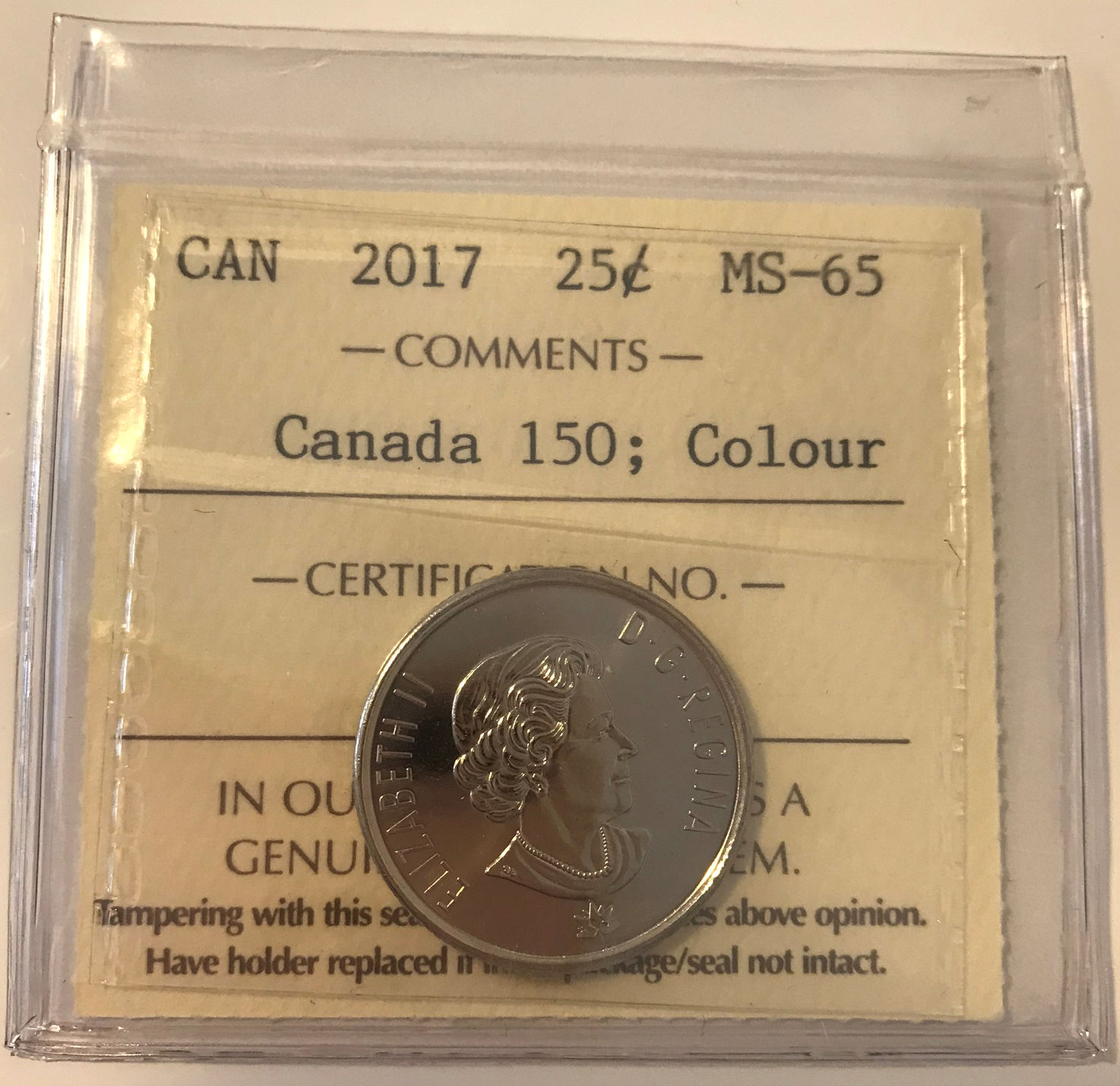 2017 Canada 25-cent “150” ICCS MS65 Color
