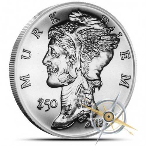 But beware! Lady Liberty has had her day. On the obverse her once emblematic Phrygian cap is now decaying and dishevelled hair along with oozing brains can be seen protruding from the once pristine cap. Torn ligaments and rotting flesh replace the once delicate lines of her beautiful face. Even her teeth are visible as places once covered by flesh are now laid bare. The word “Liberty” has even been replaced by “Murk Diem”, a corruption of the old saying, “Carpe Diem” ie “Seize the day” or perhaps “Mercurii Die” “Day of Mercury”. The year of mintage and value in cents have been replaced by 50 Zombucks and 2018, the year the zombies walk the earth. One thing is certain, no one is safe from the Zombie Apocalypse.