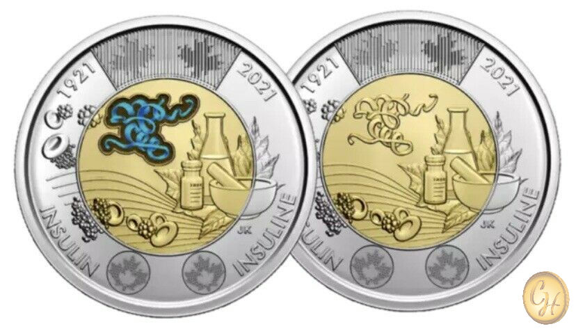 2021 Canada $2 2-dollar BU 100th Anniversary Insulin – Set of 2 Coins – Color & NC